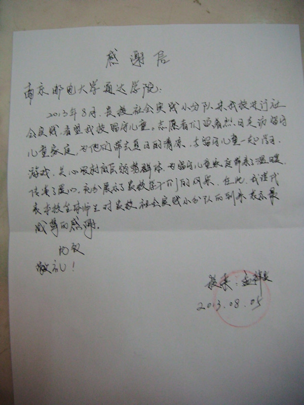 活动即将结束,八巨小学的负责人专门为志愿者团队送来了感谢信,大家纷纷表示要珍惜自己所拥有的良好的生活条件,努力学习,学有所成,为社会做贡献,为留守儿童的成长贡献出自己的一份力量!如果有机会,我们明年再来!