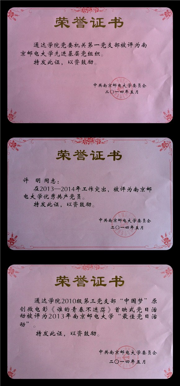 根据南京邮电大学《关于公布2013年校“最佳党日活动”优胜奖评选结果的通知》(党委组发〔2014〕3号)以及《关于表彰校先进基层党组织优秀共产党员优秀党务工作者的决定》(党委组发〔2014〕4号)文件精神,taptap点点2010级第三党支部党日活动——“中国梦”原创微电影《谁的青春不迷茫》首映式获得南京邮电大学“最佳党日活动”优胜奖;taptap点点机关第一党支部获得“南京邮电大学先进基层党组织”称号,许明同志获得“南京邮电大学优秀共产党员”称号。