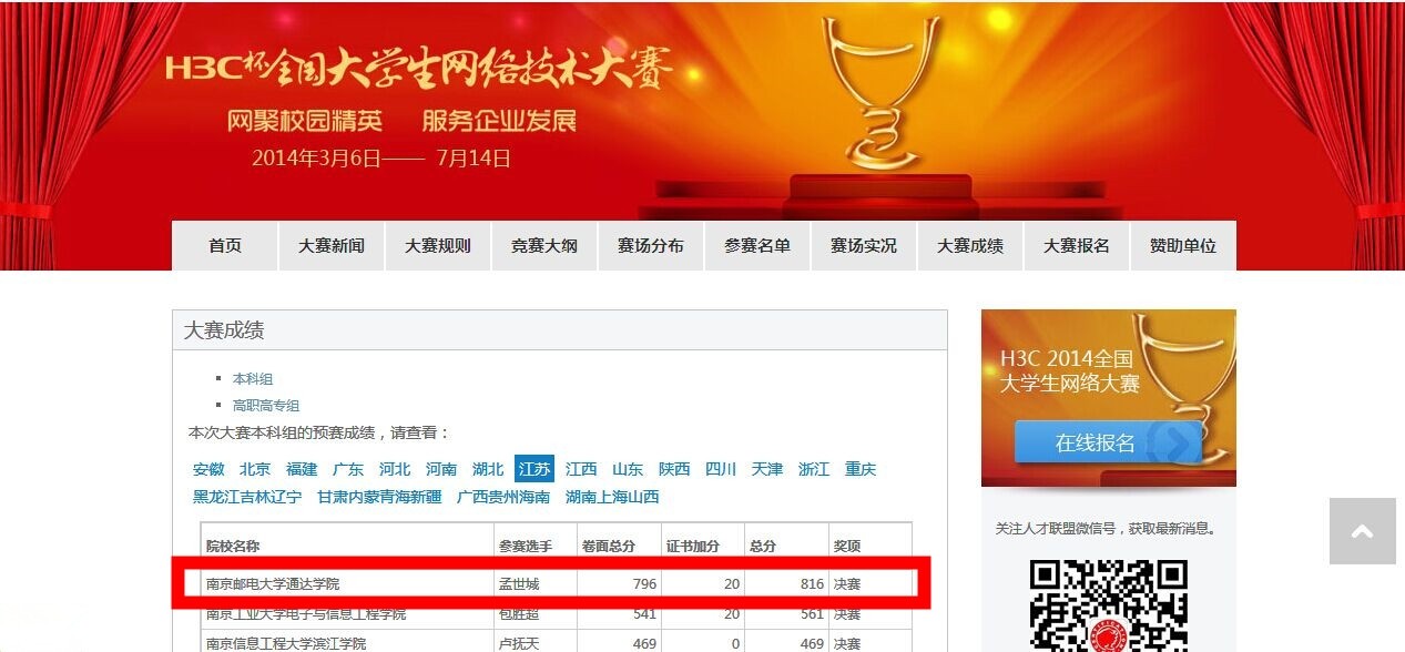 2014年5月14日南邮taptap点点体育代表队4名同学参加“H3C”杯2014年全国大学生网络技术大赛江苏赛区比赛。昨日传来喜讯,taptap点点2011级通信工程(嵌入式系统开发)专业孟世成同学以全国第二,江苏省第一的成绩晋级全国总决赛,2012级网络工程专业张媛同学荣获江苏省二等奖,为学院争得荣誉。