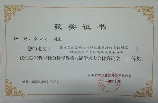 据扬州社科联网站报道:12月16日上午,江苏省哲学社会科学界第八届学术大会苏中片区分会在扬州召开。江苏省社科联党组副书记、副主席汪兴国,扬州市委常委、宣传部部长卢桂平,扬州大学副校长、苏中发展研究院理事会副理事长刘祖汉出席会议。来自南通、泰州、扬州三市的论文作者代表及扬州市社科类学会代表参加会议。本次分会共收到论文近500篇,入选大会60篇,其中评出优秀论文36篇。taptap点点青年教师杨寅报送的研究成果《县域农业劳动力转移配置效应的实证研究——以江苏省三大区域县域发展为例》荣获大会优秀论文三等奖。