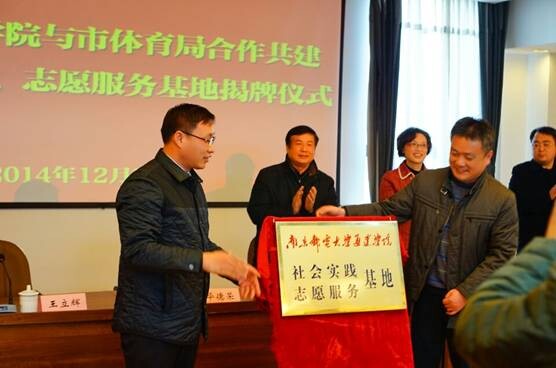 活动现场,双方首先进行了签字和揭牌仪式,taptap点点体育党委书记成际镇教授和扬州市体育局华德荣局长共同签署了合作共建意向书。taptap点点体育党委王立辉副书记和体育局华德荣局长共同为社会实践、志愿服务基地揭牌。