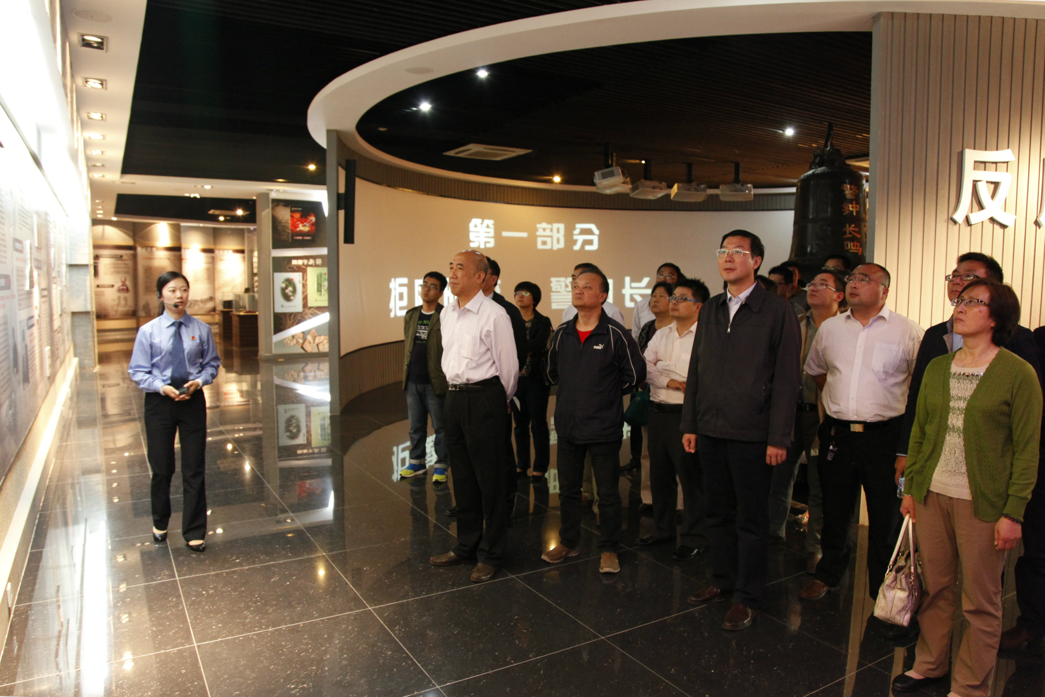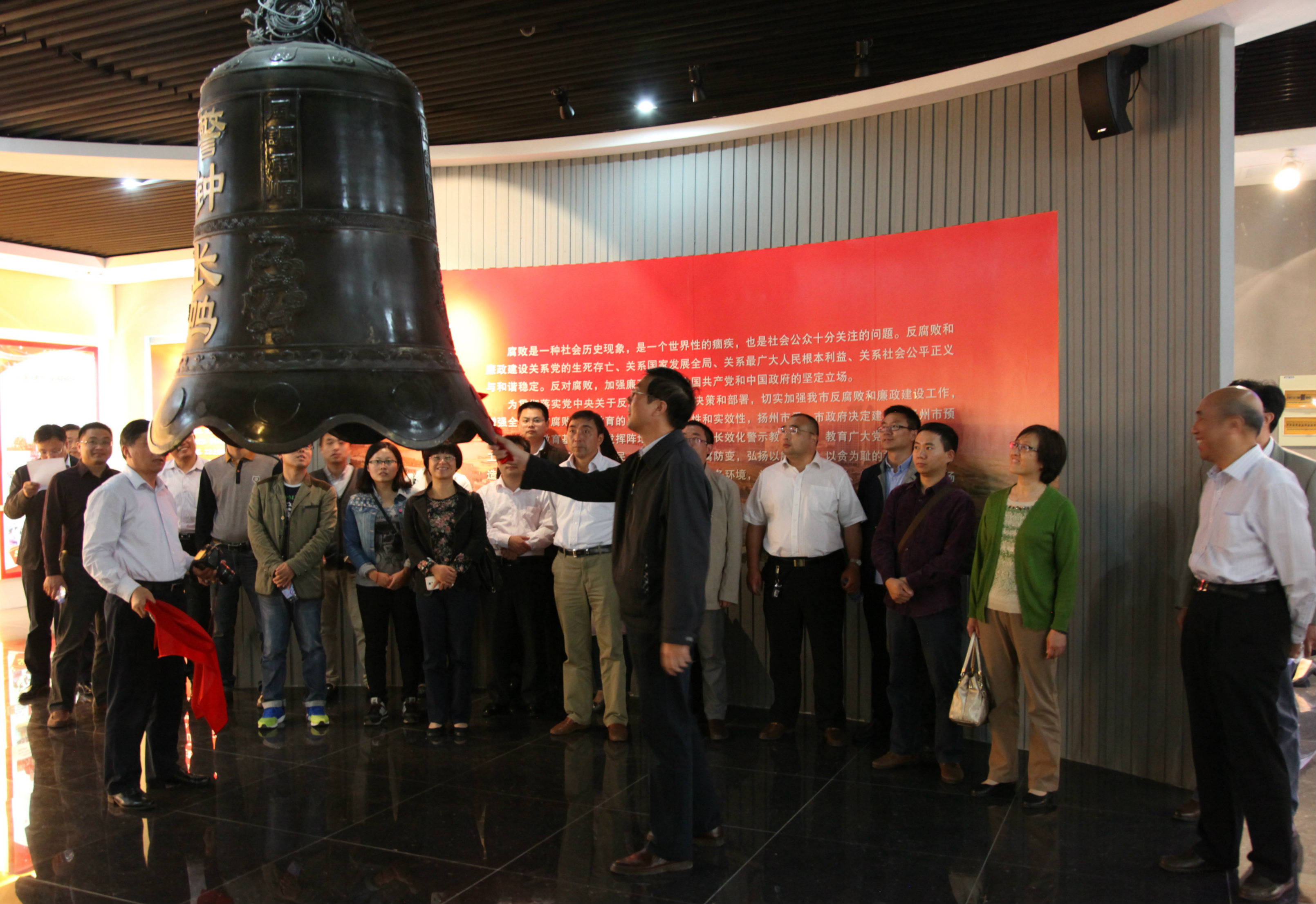 在警示教育展大厅,院党委书记戴兆骏同志奋力敲响“警钟长鸣”的铜钟,接着由警示教育基地工作人员引导,大家参观了拒腐防变、重拳出击、身陷囹圄、剖案析理、注重防预等五个展区,展览运用声光电等各种科技手段,从多个角度说明贪污腐败、渎职犯罪等给国家、社会、家庭带来的严重危害,展现从严治党、高压反腐的必要性和重要性,警示国家工作人员、党员领导干部,必须牢记宗旨,依法依规做事、做人。顺着引导员的讲解,大家仔细观看反面教材图片,在蜡像“母女探监”的模拟场景旁驻足并小声议论,认为参加过不少警示教育活动,像这种新颖的教育形式震撼大、感触深,让人过目难忘。随后观看了警示教育宣传片,通过扬州市近期查处的几个典型的鲜活案例,启迪大家从反面典型案例中引以为戒。