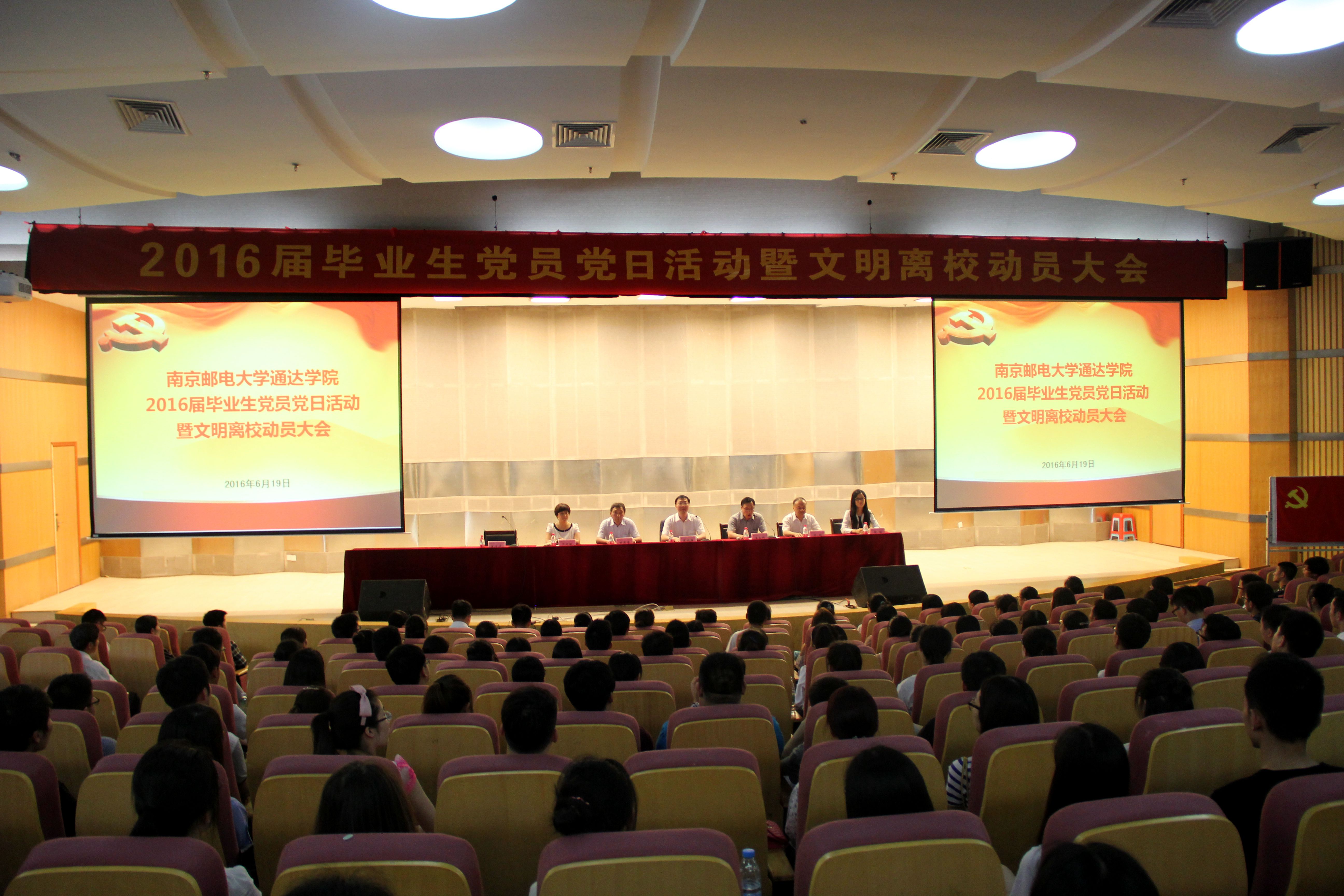 6月19日下午,学院党委在行政楼报告厅举行了2016届毕业生党员党日活动暨文明离校动员大会。152名2016届毕业生党员济济一堂,院党委委员、各毕业生党支部书记和学工处、团委等部门负责人出席大会。会议由院党委副书记王立辉同志主持。