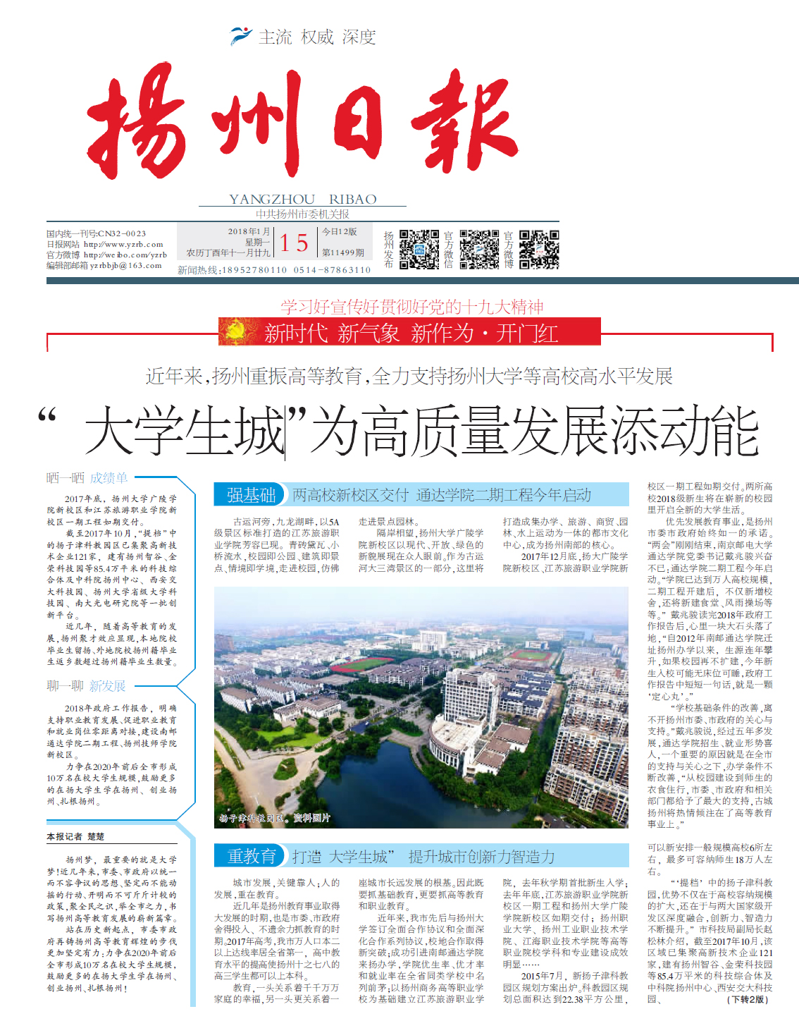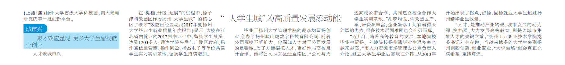 【扬州日报】头版头条:“大学生城”为高质量发展添动能