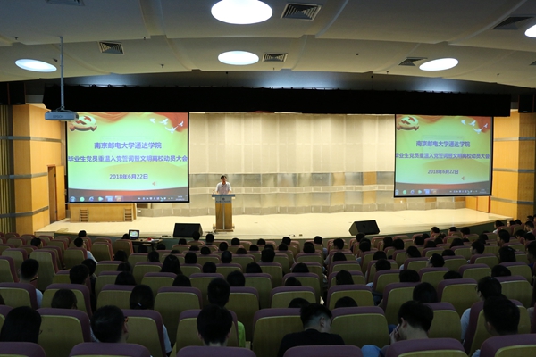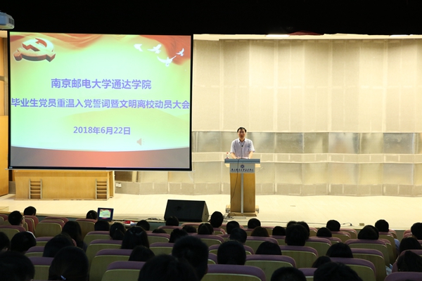 6月22日下午,院党委在行政楼报告厅举行了2018届毕业生党员重温入党誓词暨文明离校动员大会。院党委委员、各学生党支部书记和学工处、团委等部门负责人,以及全体毕业生党员和近期加入党组织的预备党员出席大会。会议由院党委副书记王立辉同志主持。