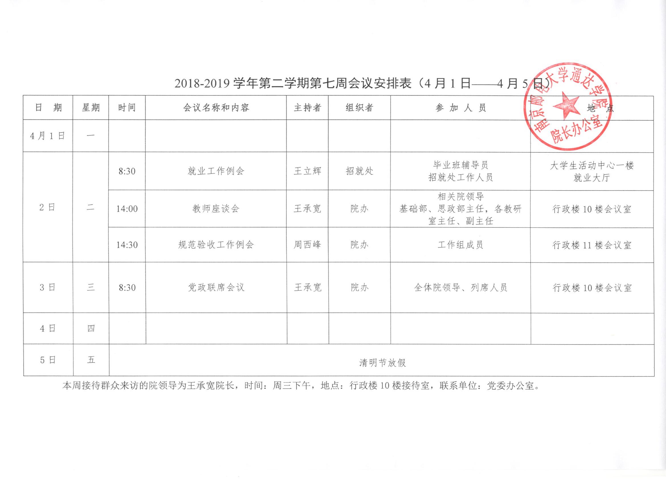 2018-2019学年第二学期第七周会议安排表