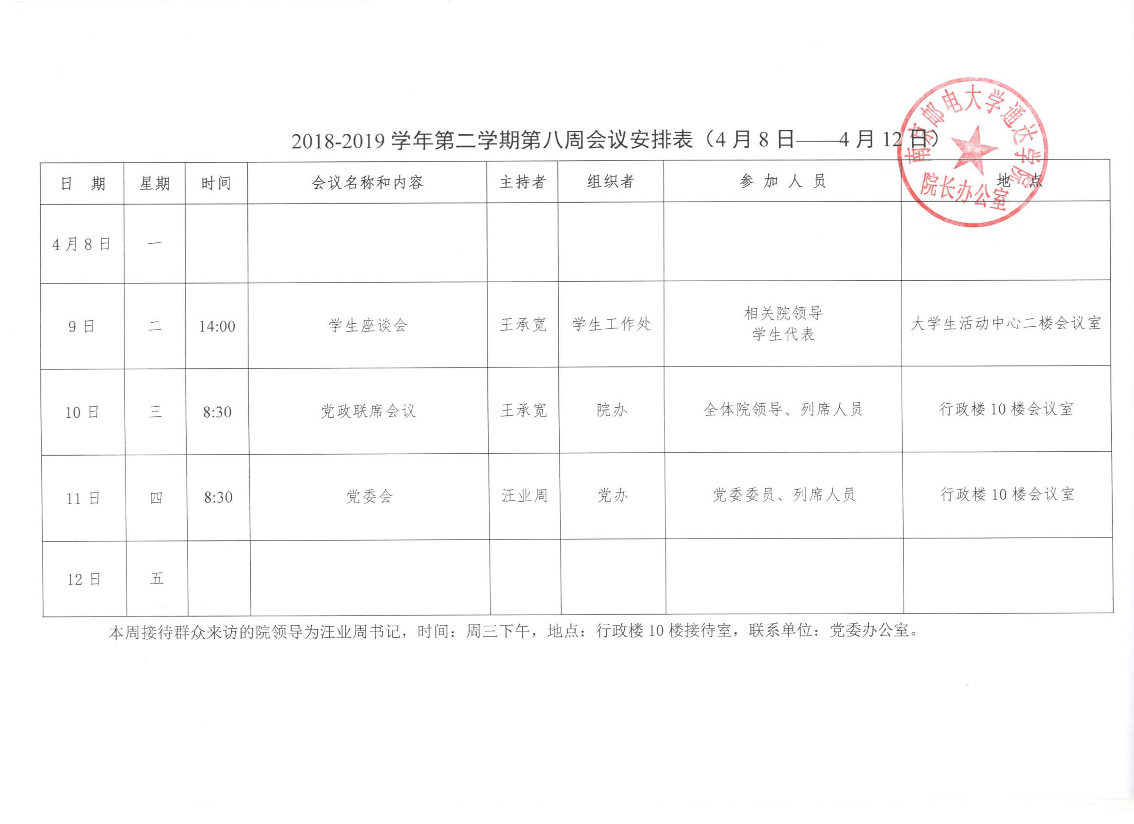 2018-2019学年第二学期第八周会议安排表