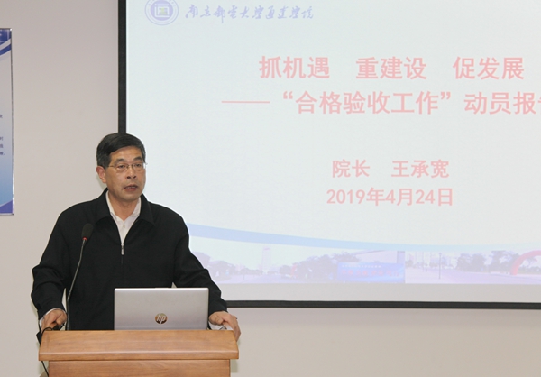 王承宽院长作了题为《抓机遇 重建设 促发展》的动员讲话,他指出:潜心研究政策找依据,这是我们做好“合格验收工作”的前提;细心对照标准找家底,这是我们做好“合格验收工作”的基础;耐心结合自评找差距,这是我们做好“合格验收工作”的关键;精心凝练报告找亮点,这是我们做好“合格验收工作”的核心。他还就做好“合格验收工作”提出了四点要求:加强领导、精心策划;广泛宣传、充分发动;分工负责、协调配合;严明纪律、责任到人。