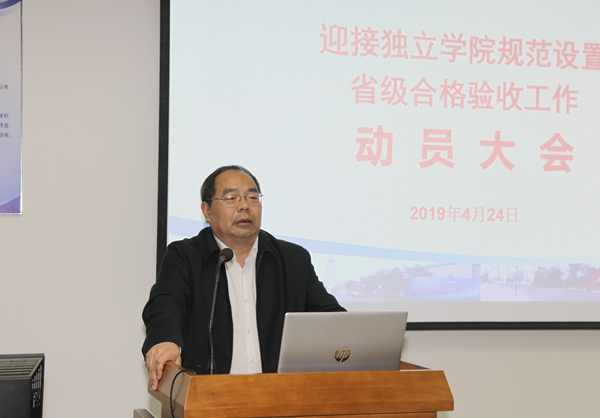 4月24日下午,学院在图书馆四楼声像放映室举行了迎接独立学院规范设置省级合格验收工作动员大会。会议由党委书记汪业周主持。全体院领导、部门负责人、教学部主任、党支部书记、教研室负责人、相关部门内设机构负责人、“合格验收”工作组成员参加了会议。