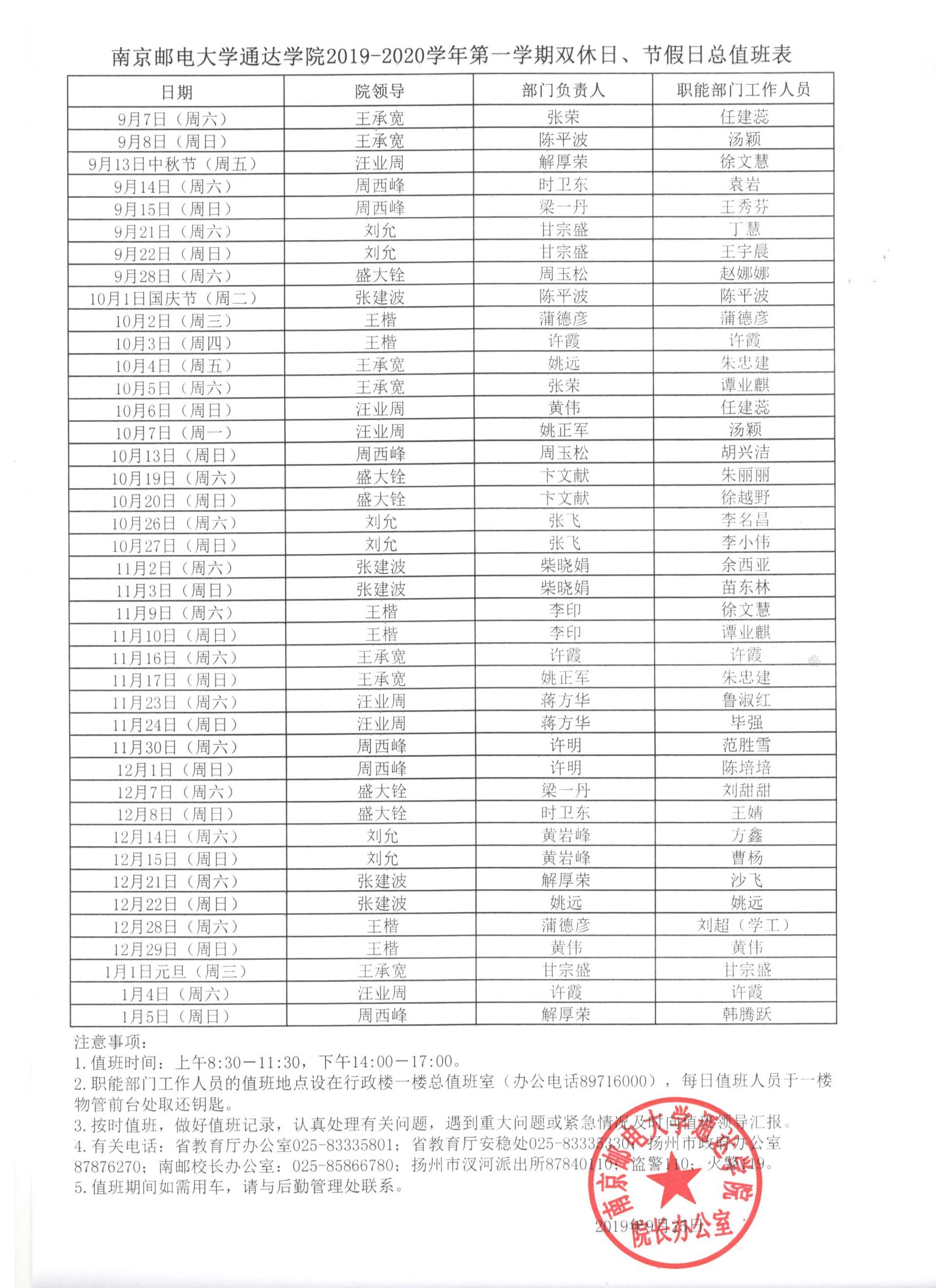 taptap点点体育2019-2020学年第一学期双休日、节假日总值班表