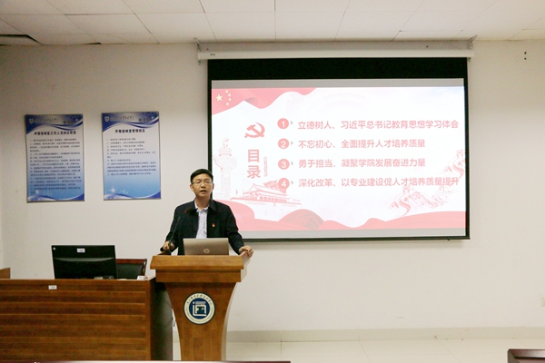 专题党课党委书记带头开讲,10月30日,院党委书记汪业周在院学术报告厅以《突出政治建设,提升政治素质——新时代党员干部政治建设的学习体会与调研思考》为题,给院领导班子成员、中层部门单位负责人、党支部书记及全体师生党员近300人,上了一堂精彩的专题党课。10月30日晚,院长王承宽以《践行以人民为中心思想,创建高水平应用型大学》为题,给所在党支部和所分工联系的部门单位、党支部的党员讲课。10月31日,副院长盛大铨以《70年光辉历程给我们的启示》为题、副院长刘允以《牢记立德树人使命,全力提升教学质量》为题、纪委书记张建波以《深刻理解全面从严治党的内涵和意义》为题、副书记兼副院长王楷以《坚持人的全面发展思想,着力提升学工队伍建设水平》为题,先后给所在党支部和所分工联系的部门单位、党支部的党员讲课。
