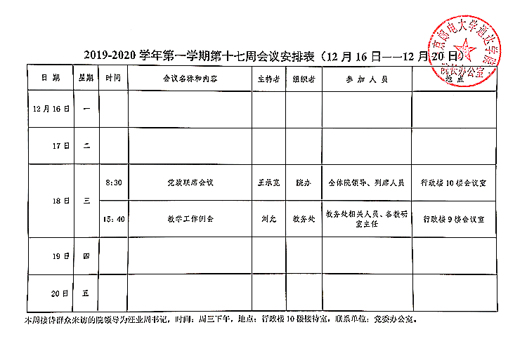 2019-2020学年第一学期第十七周会议安排表