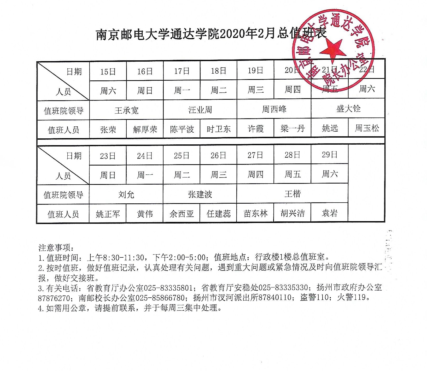 taptap点点体育2020年2月总值班表