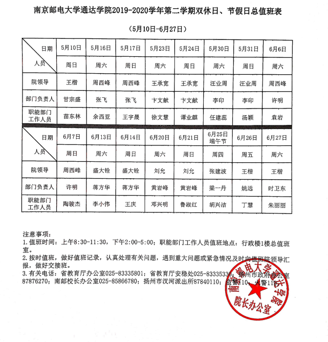 taptap点点体育2019-2020学年第二学期双休日、节假日总值班表