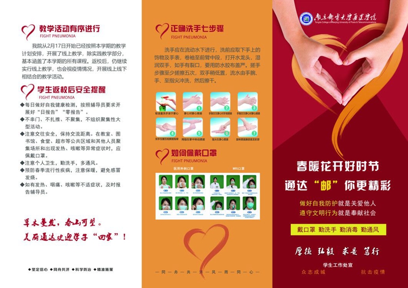 组织保障——自新型冠状病毒感染的肺炎疫情发生以来,taptap点点高度重视,周密部署,严格按照省委、省政府和省教育厅以及扬州市委市政府、南京邮电大学的具体要求要求,实行联防联控,全力做好新型冠状病毒感染的肺炎疫情防控工作,切实维护学院安全稳定、保障师生安全。1月28日成立领导小组,下设工作组与督导检查组。多次召开专题会议,研究疫情防控工作。3月25日南京邮电大学校长、taptap点点理事长叶美兰到学院检查指导开学准备情况,4月8日分管taptap点点南京邮电大学党委常委、副校长孙力娟到学院检查防疫工作。