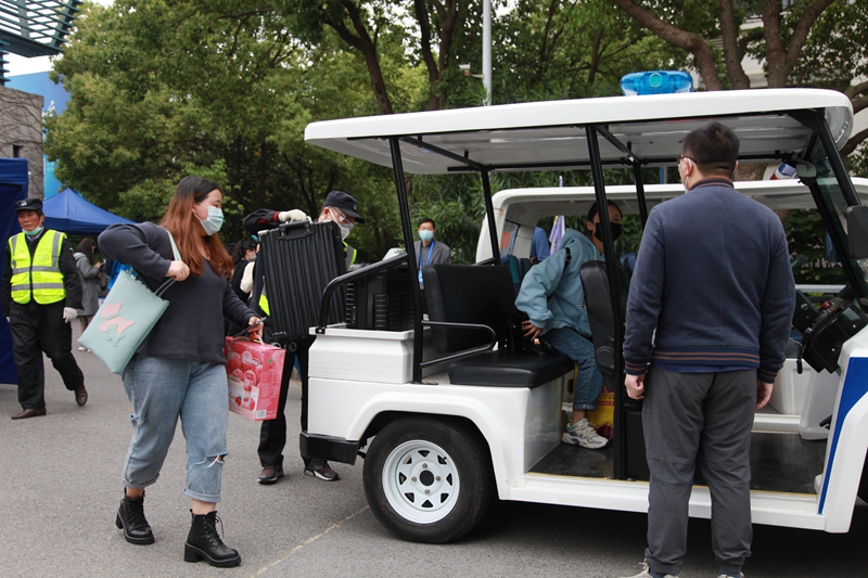 接力爱的专送车——taptap点点分别在扬州汽车东站、汽车西站、火车站三个点安排教师志愿者接站,采取“点对点、一站式”安全有序地直接送达校园,护送“最后一公里”。在接站现场,教师志愿者们认真的对学生进行身份核验、健康核验、基础消毒、体温检测,乘车登记等工作,虽然工作量大,但是他们的脸上却未见疲惫,更多的却是对学生们的关爱。“回来的路上顺利吗?身体有没有不舒服之类”等等暖心的话语不绝于耳。到校后taptap点点还为学生安排了抵达宿舍区的接驳车、行李运输车,同时并为返校学生准备了体温计、消毒片、消毒专用喷壶等防疫物资。