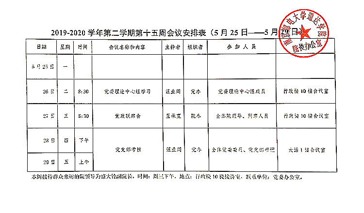 2019-2020学年第二学期第十五周会议安排表