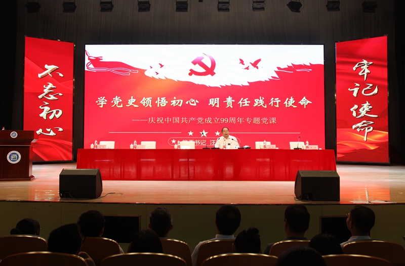 表彰仪式后,院党委书记汪业周给全体与会党员作纪念中国共产党成立99周年专题党课。汪书记首先勉励学院各基层党组织和广大共产党员,要以受表彰的先进典型为榜样,以优秀为标杆,见贤思齐,努力在新起点上提升新境界,再创新业绩。汪书记的党课,以《学党史领悟初心 明责任践行使命》为题,从“在学党史中领悟初心,让理想信念更加坚定”“在讲忠诚中奉献智力,让责任担当更加领先”“在牢基础中践行使命,让基层组织更加强大”三个方面作深入浅出的讲解,突出党史党章党规教育,深入学习贯彻习近平新时代中国特色社会主义思想,观点鲜明,内容充实,逻辑性强;贴近学院实际,注重解决党员群众的理论困惑和现实问题,触及党员灵魂、引起大家思想共鸣。启迪大家更清醒地认识中国共产党的初心使命,更深刻地理解“红色政权来之不易、新中国来之不易、中国特色社会主义来之不易”,更深切地感悟“中国共产党为什么能”“马克思主义为什么行”“中国特色社会主义为什么好”,进而从灵魂深处汲取历史智慧、厚植爱党爱国情怀,进一步坚定“四个自信”。汪书记号召全院党员尊重敬畏党史,谨记建党初心,继承革命精神,保持革命斗志,以奋发有为的精神状态,自觉为实现中华民族伟大复兴而奋斗。