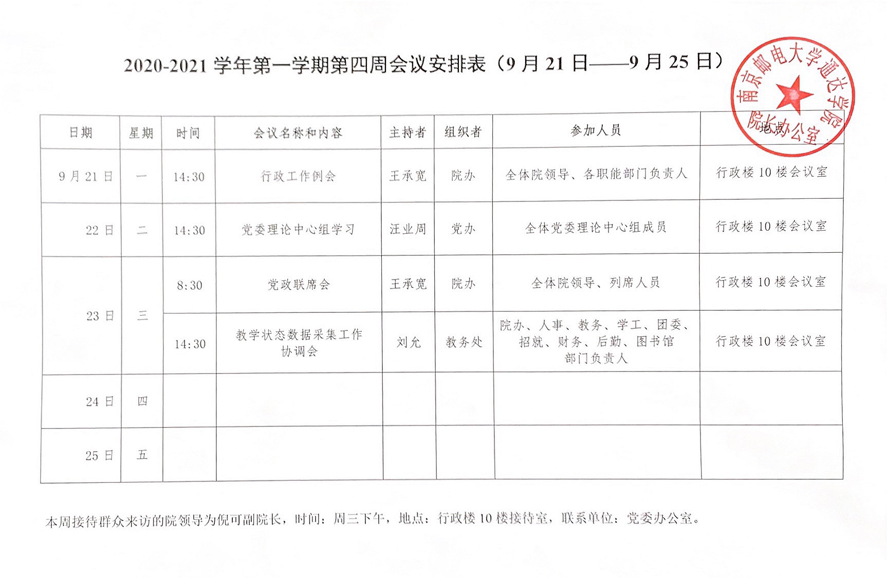 2020-2021学年第一学期第四周会议安排表