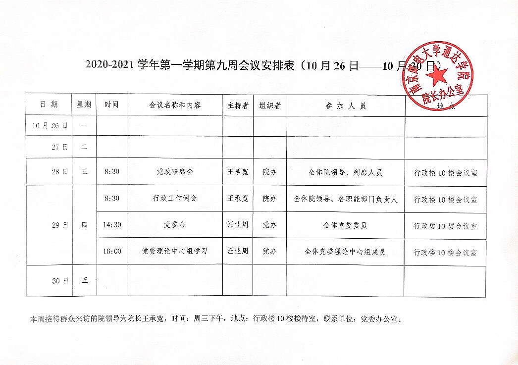 2020-2021学年第一学期第九周会议安排表