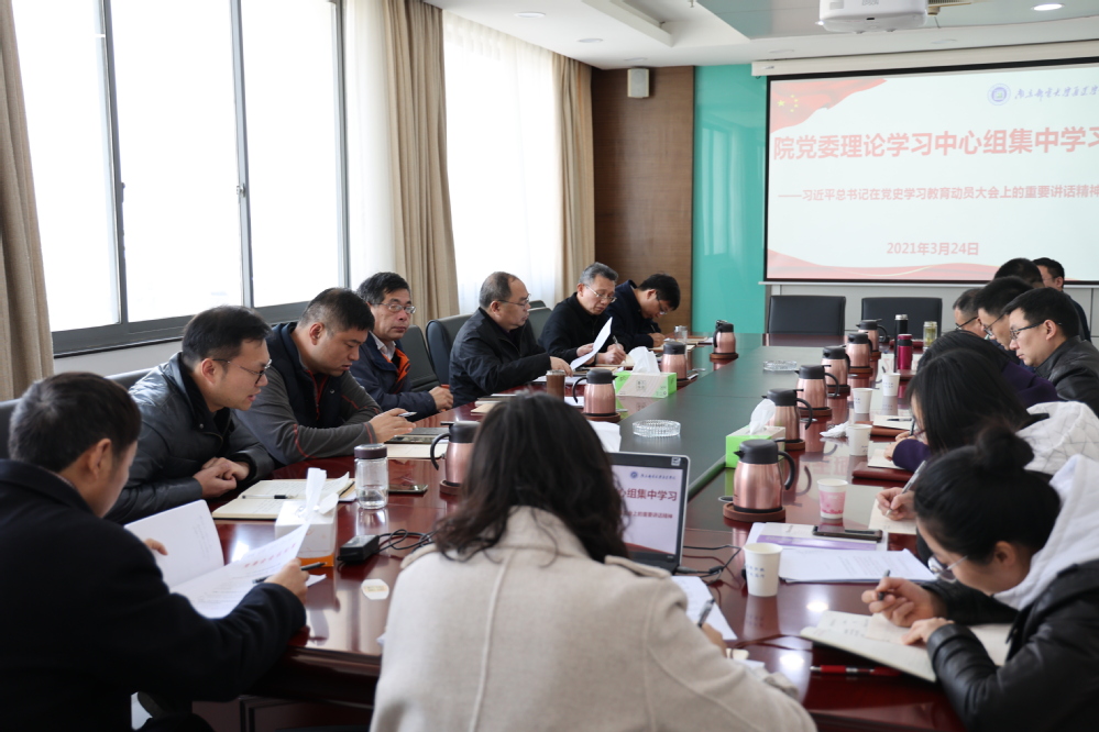 3月24日上午,院党委理论学习中心组在学院行政楼1013会议室,开展了“习近平总书记在党史学习教育动员大会上的重要讲话精神”专题学习。院党委书记、党委理论学习中心组组长汪业周主持学习会。