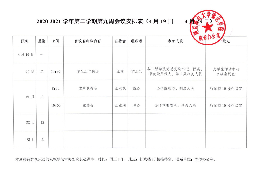 2020-2021学年第二学期第九周会议安排表