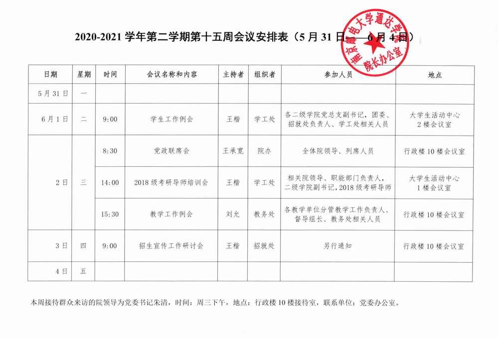 2020-2021学年第二学期第十五周会议安排表