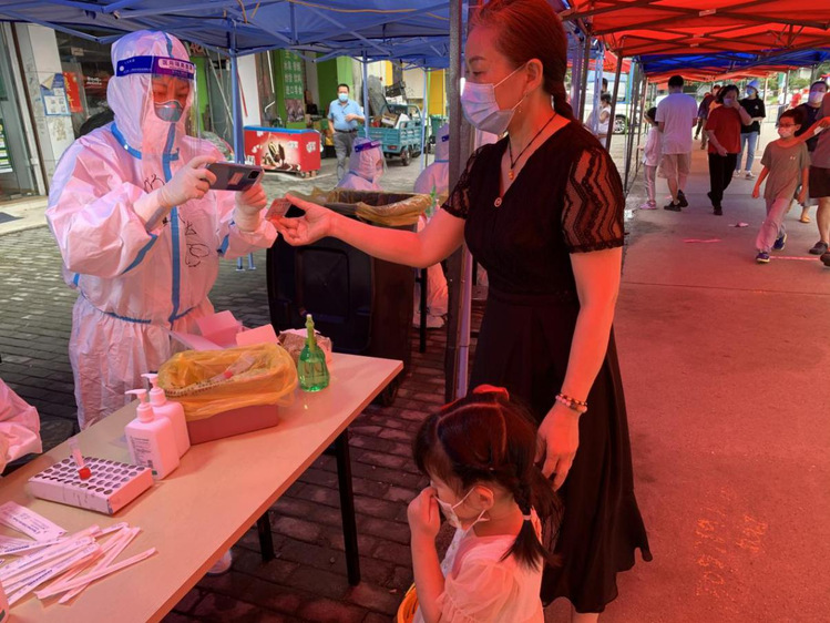 我在第一时间报名参加了志愿者,并被分到了邗上社区负责核酸检测点的身份信息登记工作。在新世纪花园检测点,有这样一个特殊家庭引起了我的注意。一位五六岁小女孩,身高刚刚超过检测台的桌子,和同龄的孩子被爸爸妈妈牵着手来做核酸检测不一样,每次她都站在最前面,手上拿着四张身份证,分别是爷爷、奶奶、爸爸、妈妈。奶奶和爸爸的身体不是很好,每次都是家人推着轮椅过来。这样的一个家庭都能如此积极地配合核酸检测工作,我对他们是充满敬意的,这个懂事的小女孩也给我留下了深刻的印象。第一次看到她还是怯生生的,不知道该把身份证拿手里还是放桌子上,显得有些害羞又有些局促不安,我耐心的告诉她,一张一张的出示给我看就行,有时她会无意识的碰一下检测的桌子,我们会说:“小朋友的手不要放在桌子”。几轮下来她已经很熟悉流程,神情上也轻松许多,走的时候还会跟我们说一句阿姨辛苦了。听到这样的话,觉得特别欣慰,汗水和辛苦都是值得的。