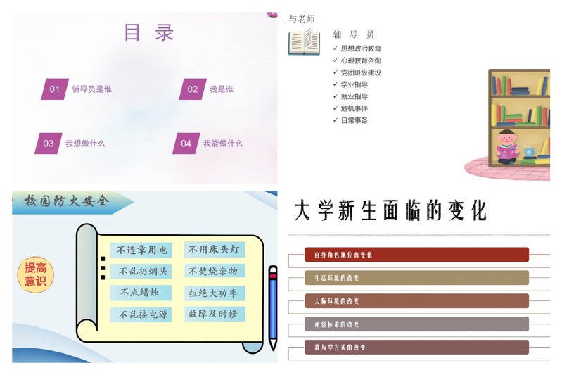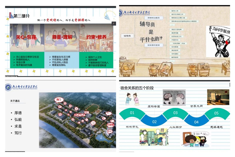 评比活动中,辅导员根据自选主题进行主讲,语言轻松活泼,形式丰富多样,内容精彩纷呈。陈静老师主讲社团和宿舍,引导学生要关心包容、尊重理解、约束与修养建立良好的宿舍关系;靳薇弘老师主讲考试和竞赛,结合自己参加学科竞赛经验和成果为学生树立榜样;刘阳老师主讲思想教育主题,提出爱国三问,引导学生爱国、爱校、爱学习;汤哲妍老师主讲安全主题,介绍防疫、防火、防盗、防诈骗以及出行安全和饮食安全;宰华峰老师主讲人际交往,教授学生如何与舍友、班委、学长学姐、恋人、老师、父母相处;张靖颖老师从认识大学、大学变化、大学适应三个方面阐述大学生角色转变;张俐从介绍辅导员的工作内容,带领学生认识自己,引导学生进行学习规划;张雅琪老师主讲宿舍关系,总结出宿舍关系的五个阶段、舍友相处的四大原则、为人处世的六大箴言。辅导员演讲结束后,学工处解厚荣处长进行了点评,他认为此次参与的8位老师都能充分准备,课件制作精美,主题突出鲜明,表达清晰明确。同时他也提醒各位老师语言表达要注重讲究艺术,实际工作中要注意方式方法,更需要建立起与学生良好的信任关系。