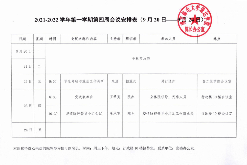 2021-2022学年第一学期第四周会议安排表
