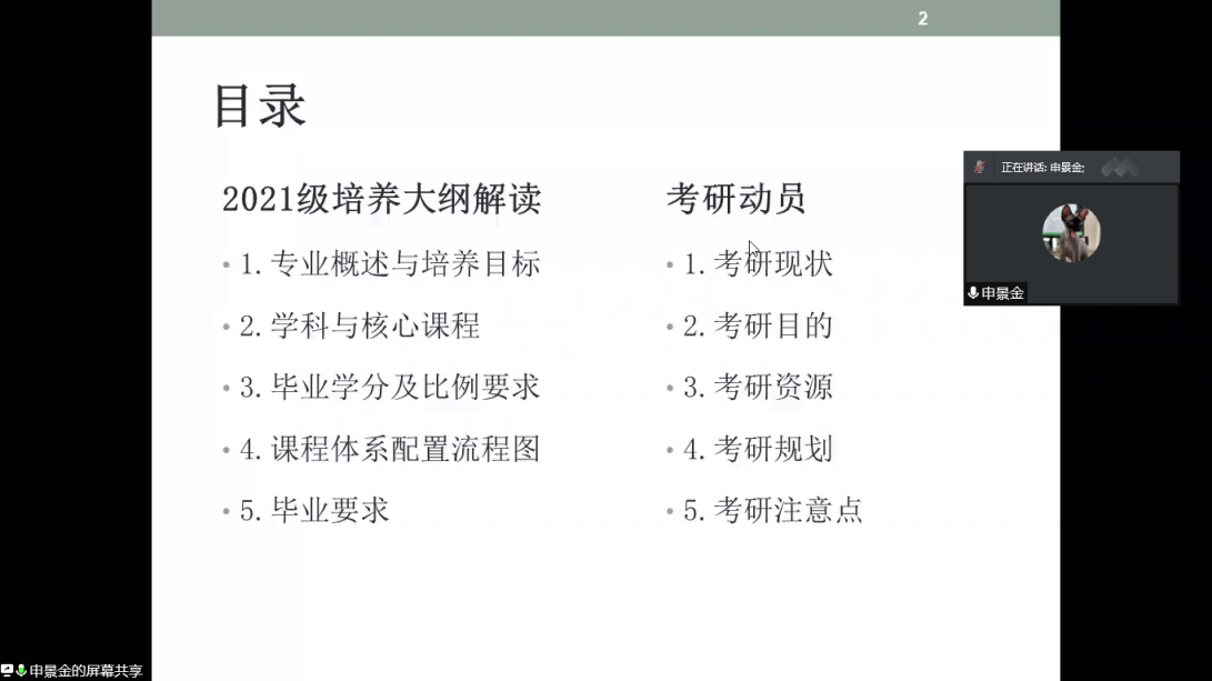 申景金老师针对自动化专业主要围绕培养方案解读与考研动员两部分展开。首先对专业进行概述并带学生了解本专业的培养目标;其次详细讲解本专业的学科与核心课程,毕业学分及比例要求,自动化课程体系配置流程图及毕业要求,使学生对所学专业和后续课程有了基本认识,具有一定的指导作用。然后申老师通过具体的数据给学生分析了考研现状及考研目的,并从考研资源,考研规划及考研注意点给学生提供了一系列的参考建议,让学生有了初步的学习方向。