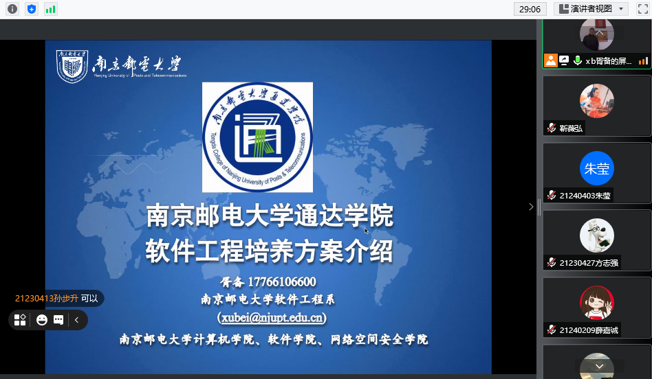 为加强2021级新生对所学专业的认识,提升学院人才培养质量,9月15日下午,计算机工程学院于线上分批次召开21级新生专业解读会 。南京邮电大学戴华、胥备、亓晋、夏彬、霍智勇、柯昌博、赵莎莎等7位老师受邀担任专业解读人。学院全体领导、辅导员及各专业新生参加会议。