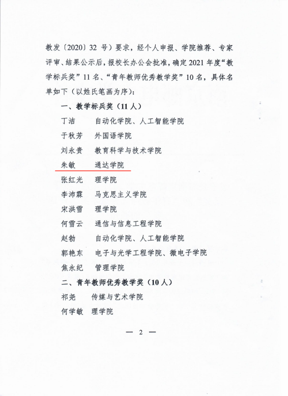 根据《南京邮电大学“教学标兵奖”、“青年教师优秀教学奖”和“优秀教学管理奖”评选办法(修订)》文件精神,结合评审专家组评选意见,taptap点点朱敏同志被授予“南京邮电大学2021年度教学标兵奖”。