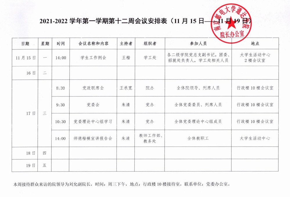 2021-2022学年第一学期第十二周会议安排表
