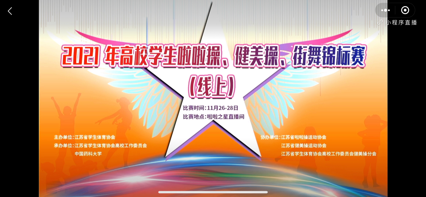 本次比赛由江苏省学生体育协会主办,江苏省学生体育协会高校工作委员会、中国药科大学承办,江苏省啦啦操运动协会、江苏省健美操运动协会、江苏省学生体育协会高校工作委员会健美操分会协办。为了严格落实疫情防控工作,此次比赛采用了线上直播形式。我院啦啦操队在刘允副院长的支持和帮助下,由黄小波任领队、李瑛瑛任教练,带领taptap点点啦啦操队28名队员参加普通院校组校园啦啦操和规定啦啦操项目,与省内37支代表队近1000余人同场竞技。