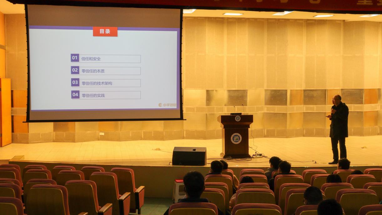 讲座伊始,陈教授讲到安全与信任、零信任安全的理念;接着,陈教授又讲述了零信任技术框架、零信任的逻辑组件和三种零信任的实现方案;最后,陈教授给我们用生动的案例给我们展示了零信任网络安全的实践。