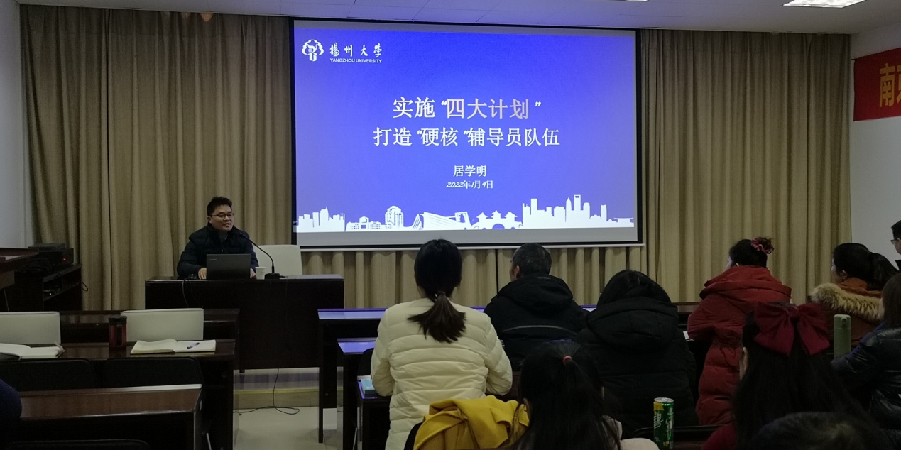 下午的培训由学工处处长解厚荣主持。扬州大学教授、博士生导师刘佳作《学生工作中的沟通认知和行为艺术》的专题报告,她从沟通的定义、沟通中存在的障碍、解决沟通障碍的方法、沟通的能力和技巧等方面,结合自身20多年的学生管理工作经历,通过丰富的学生管理案例让大家进一步认识到沟通的重要性。扬州大学党群总支书记、学生工作处副处长居学明作了《实施“四大计划”,打造硬核辅导员队伍》专题报告,他从高校辅导员队伍建设与发展历程回顾、辅导员队伍建设面临的“困境”和辅导员队伍建设的实践探索三个维度,结合扬大的实际经验,重点分享了辅导员队伍建设的“四大计划”。