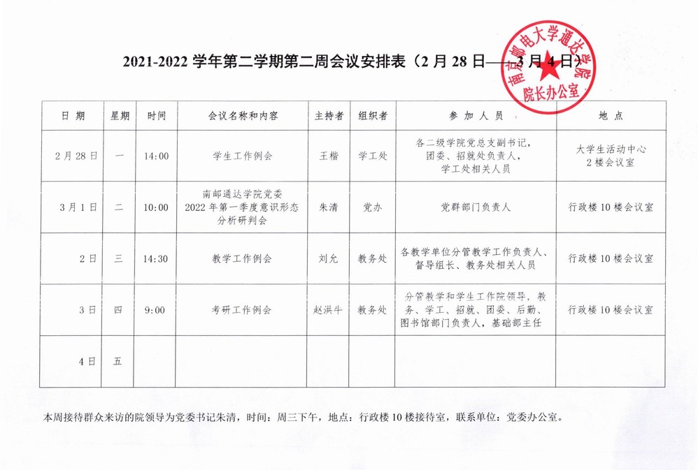 2021-2022学年第二学期第二周会议安排表