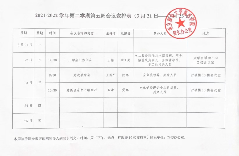 2021-2022学年第二学期第五周会议安排表