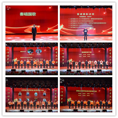 表彰环节由党委副书记、副院长王楷主持。在庄严的国歌声中,表彰大会拉开了序幕。常务副院长赵洪牛宣读了《关于颁发2020-2021学年国家奖学金、国家励志奖学金的决定》《关于颁发2020-2021学年学生奖学金的决定》《关于表彰2021年江苏省三好学生、优秀学生干部和先进班集体的决定》《关于表彰2020-2021学年优秀学生的决定》及《关于表彰2020-2021学年先进班集体的决定》,全体院领导上台为获奖学生颁奖。本学年,taptap点点共评出国家奖学金2人、国家励志奖学金165人、江苏省三好学生8人、江苏省优秀学生干部2人、江苏省先进班集体3个、院三好学生标兵64人、三好学生449人、优秀学生干部234人、一等奖学金277人、二等奖学金859人、三等奖学金1213人、技能成才奖111人、社会工作优秀奖299人、第二课堂活动优秀奖26人、学习进步奖1412人、帮扶之星奖394人、院先进班集体17个。王承宽院长、朱清书记为暑期奋斗在校园抗疫一线的青年突击队颁发了“抗疫服务先进集体”奖。