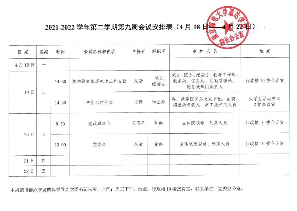 2021-2022学年第二学期第九周会议安排表