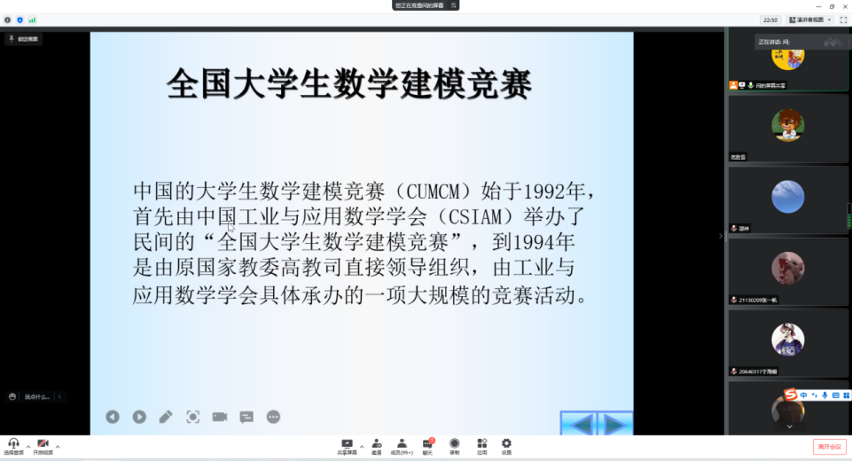 闫教授首先从学生如何备战全国大学生数学建模竞赛开始,介绍了数学建模竞赛概况、时间安排、报名流程、获奖情况、相关建议等方面的相关情况,鼓励同学们积极备战2022年全国大学生数学建模竞赛。接着,介绍了大学生数学建模的用途以及对后期学习、工作的影响。随后,用实例展示了“数学建模”的核心问题,他对模型准备、模型假设、建立模型解决问题、模型求解与分析、模型检验、模型的应用与推广等数学建模的基本步骤进行了深入浅出地讲解。