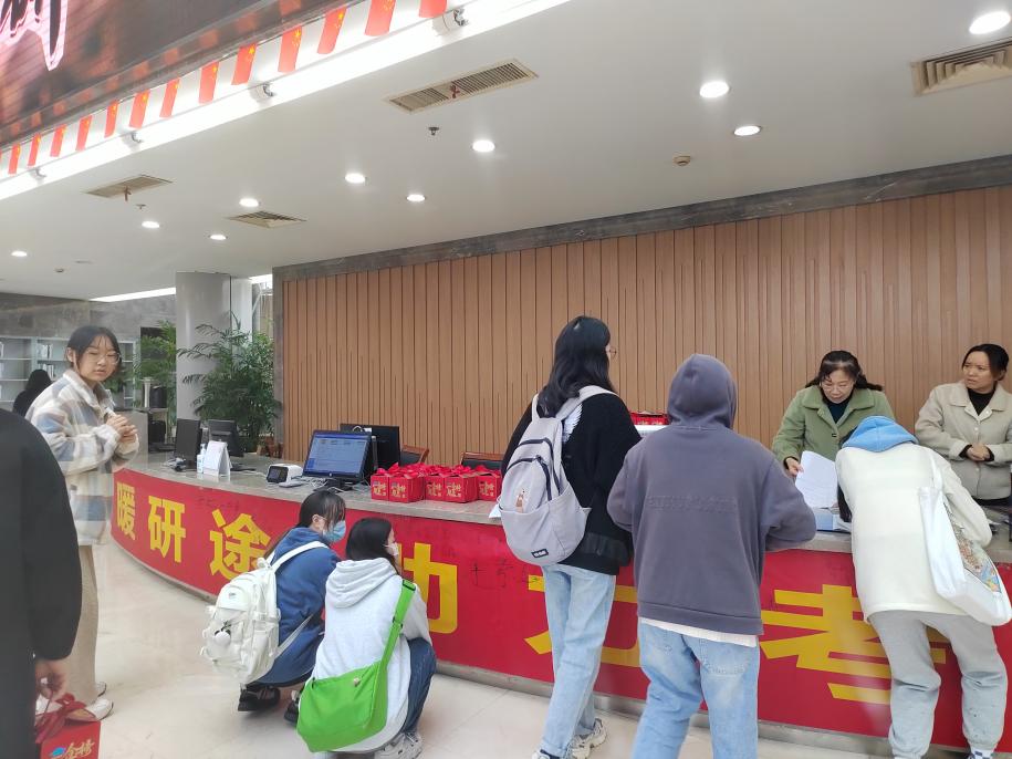 在考研倒计时的关键时刻,为了给坚持考研的学生加油鼓劲,帮助他们缓解备考压力,图书馆于11月22日上午开展了“情暖研途 助力考研”活动,为考研学生送祝福。常务副院长赵洪牛亲临现场,带领图书馆相关负责同志为考研学生送上“暖心盲盒”,并鼓励他们坚定考研信心,做好冲刺复习,保持最佳的备战状态。一份份精美的盲盒,有寓意“苹”安上岸的苹果、马到“橙”功的橙子、“棒”上有名的棒棒糖以及“逢考必过”的钥匙扣等,表达了图书馆对考研学生的真切祝福。