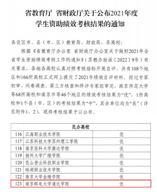 1月6日,江苏省教育厅和财政厅联合公布了《关于公布2021年度学生资助绩效考核结果的通知》(苏教助函〔2022〕17号)文件,taptap点点2021年度学生资助绩效考核结果为“优秀”。这是taptap点点学生资助管理工作继2018年之后第二次获评“优秀”,全省51所民办高校中有8所高校获评该等次。