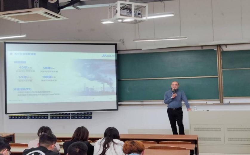 徐智成老师首先介绍了光伏行业的发展背景,为我们讲解了光伏知识,解读了双碳目标的含义,让同学们对光伏有了初步的认识和了解。随后,徐智成老师通过举例、分析,为同学们介绍光伏的应用场景及产业链,分析了光伏行业的人才现状,鼓励同学们确定目标,努力学习,积极投身其中。问答环节,同学们积极提问,徐智成老师耐心一一作答,让同学们对光伏行业有了进一步的了解。