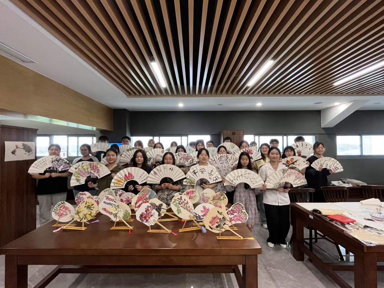 朱丽向同学们讲解了扇子的发展历史、文化背景、扇面的构图方式和折扇的制作方法。现场,同学们积极参与,经过大家充分地构思设计和绘画制作,一幅幅山水画、花鸟画、写意画刻印在素扇上,相得益彰、精美绝伦。