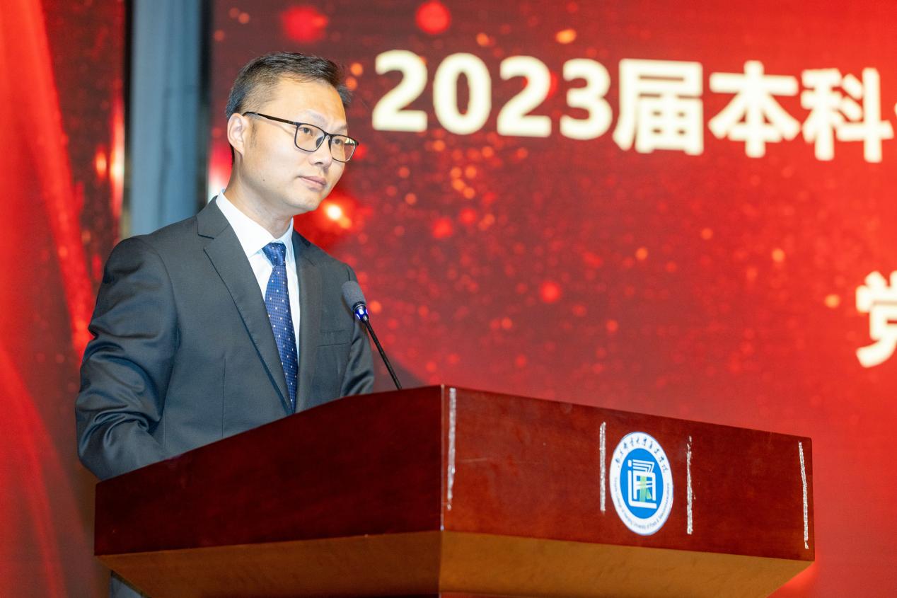 学院副院长刘允老师宣读优秀毕业生表彰决定和授予学士学位的决定。孙校长和全体院领导为2023届优秀毕业生代表颁发荣誉证书和学士学位证书,院领导分别为在专业学习、文化体育、科技创新、志愿服务、自立自强、考研升学、求职就业等方面表现突出的14名同学颁发奖杯和纪念品。学院党委书记朱清为校友联络员代表颁发聘书、赠送礼物。
