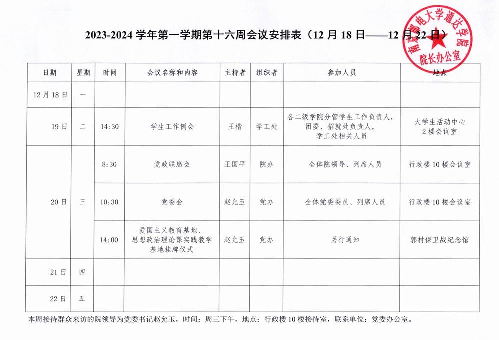 2023-2024学年第一学期第十六周会议安排表