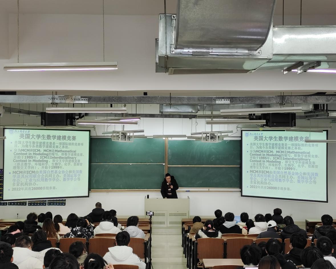 闫教授指出数学建模是一种将现实问题转化为数学模型的过程,通过数学模型的分析和求解,可以找到问题的解决方案。这种思维方式不仅在数学领域有着广泛的应用,也在其他领域如物理学、经济学、生物学等都有其独特的价值。接着,闫教授通过以2017年美赛A题为例,讲解美赛题目如何审题、做题,向学生展示了如何将实际问题转化为数学模型过程。他详细讲解了建模的步骤和方法,包括问题的定义、数据的收集和处理、模型的建立和求解等。同学们在闫教授的引导下,逐渐掌握了数学建模的基本技巧和方法。