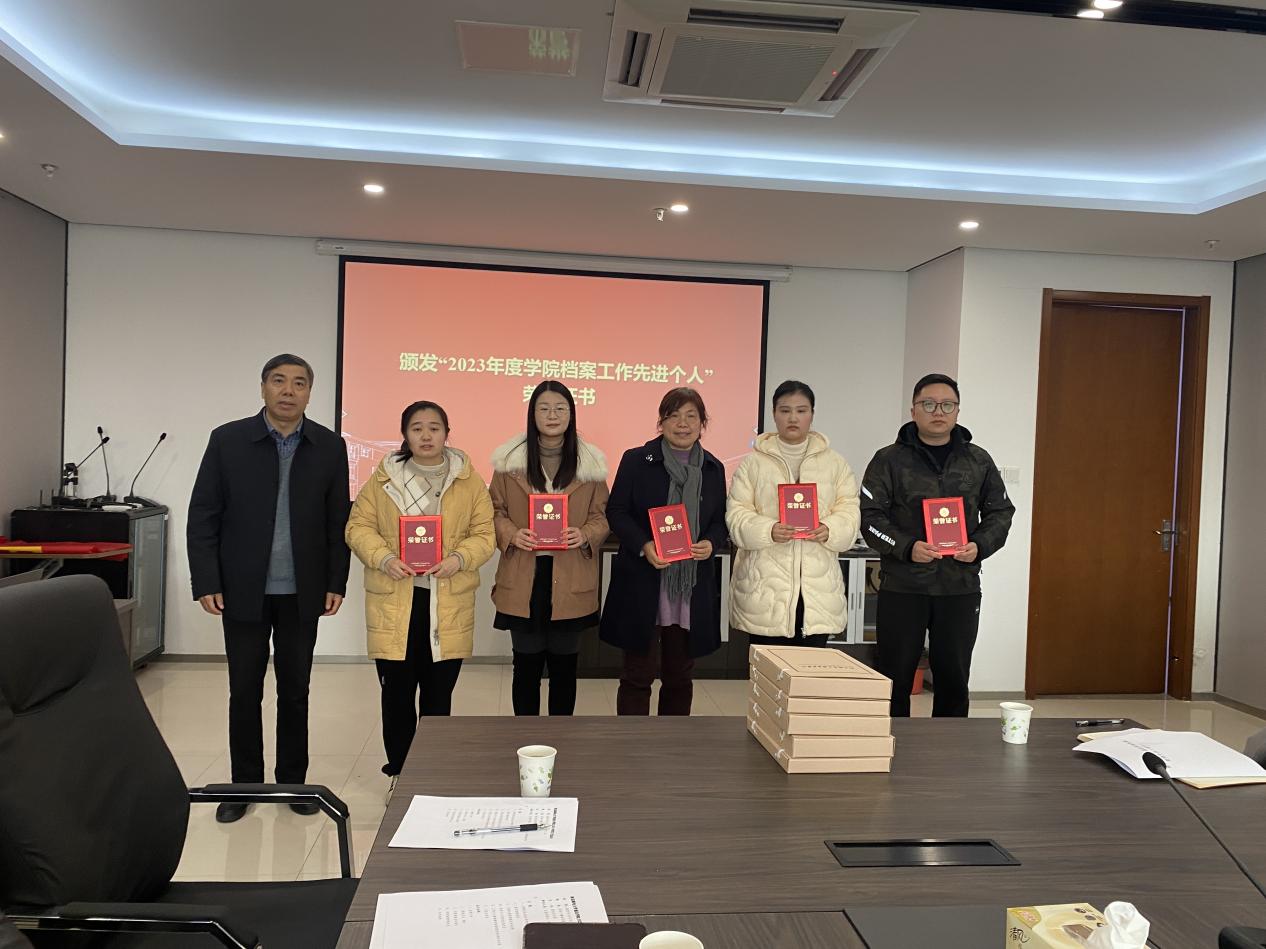 会上,办公室老师回顾总结了2023年度学院档案工作情况,并对2024年度档案工作的主要任务进行分解。王院长还为新聘任的兼职档案管理员发放了聘书。